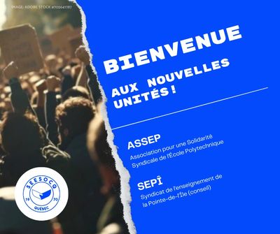 En effet les personnes salariées de l'ASSEP : Association pour une Solidarité Syndicale de l’École Polytechnique se joignent au SEESOCQ et le personnel conseil syndiqué œuvrant au SEPÎ : Syndicat de l'enseignement de la Pointe-de-l'Île se joint à leurs collègues syndiqué-e-s du personnel soutien administratif qui sont syndiqués au sein du SEESOCQ.