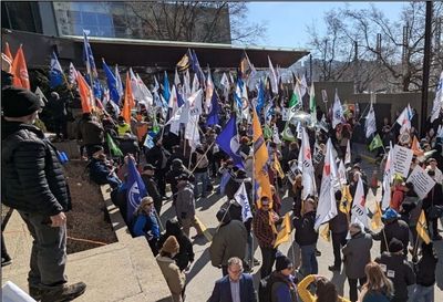 Crédit photo:  Photo prise le 14 mars 2025 par le Marxist-Leninist Party of Canada / Parti marxiste-léniniste du Canada à l'occasion du rassemblement tenu à l'édifice de la Plaza Centre-Ville à Montréal, où le ministre du Travail, Jean Boulet, devait prendre la parole lors d'une conférence organisée par la Chambre de commerce du Montréal métropolitain.