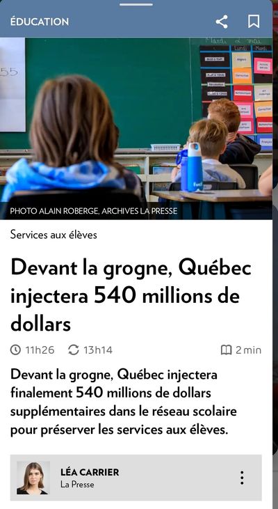 À la suite de la mobilisation syndicale et citoyenne contre les coupures de plus de 570 millions au budget du réseau de l'Éducation, le ministre de l'Éducation annonce qu'il réinjecte 540 millions pour les "services directs" aux élèves.